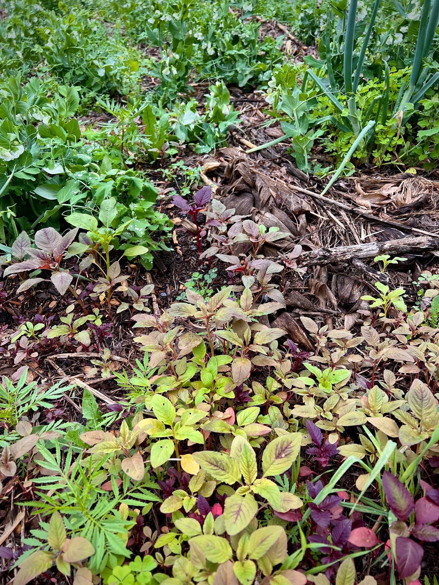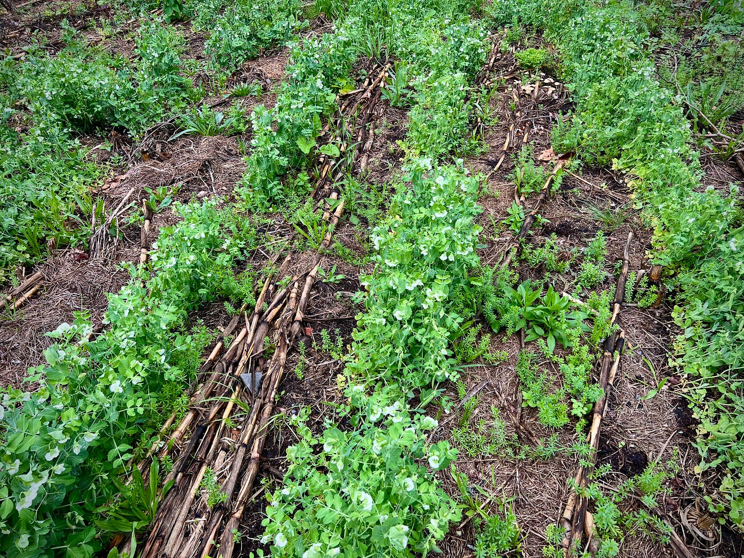 To successfully suppress weeds, I would’ve had to scatter the snap peas everywhere. This, of course, would make it impossible to harvest the peas without walking on the plants, but that’s a fine compromise since I could never harvest them all anyway.